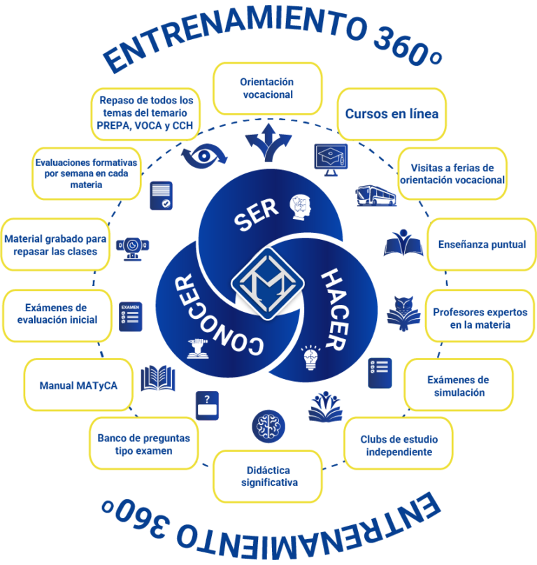 En MATyCA desarrollamos un método único de Entrenamiento 360° que acompaña a cada estudiante en tres dimensiones fundamentales: Ser, Hacer y Conocer. No solo te preparamos para responder un examen; te formamos de manera integral para que enfrentes con seguridad el siguiente paso de tu vida académica.